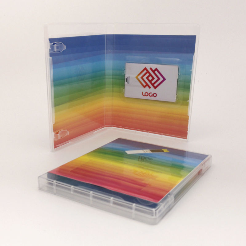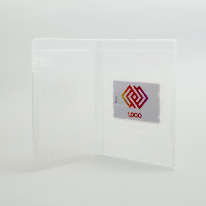 Plastična kutijica koja se otvara kao knjiga. U nju je moguće umetnuti model USB karticu. Ima poseban prozor u koji je moguće umetnuti list s grafikom po želji. Kutijica tako postaje atraktivna poklon ambalaža koju možete dizajnirati kako želite. Dobro rješenje, koje lako može zamijeniti glazbeni CD s omotom. Također na vašu želju pripremamo i dizajniramo unutarnji list.