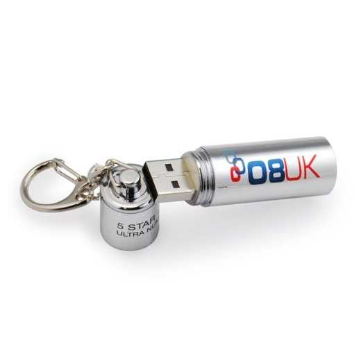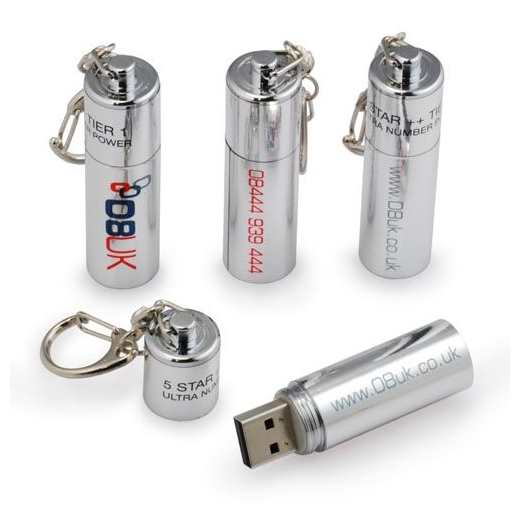 USB Stick u obliku baterije. Sastoji se od čepa, kućišta u kojemu se nalazi čip, te privjeska za ključeve. Pogodan za poslovne poklone, sajmove i kongrese. Moguća je dorada – tisak, gravura, epoksi naljepnica. Po narudžbi se mogu nasnimati i datoteke po želji. Pogodno za operativne sustave: Windows, MAC, Linux, Android.